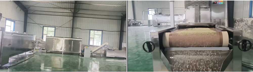The equipment of this production line includes a flour mixing machine, a rice extruder, a screw conveyor, two elevators, an electric oven (for drying), a microwave oven (for roasting) and A cooling machine (for cooling and removing moisture).
